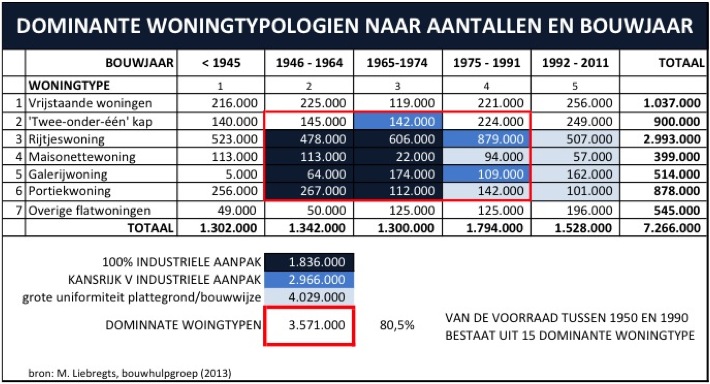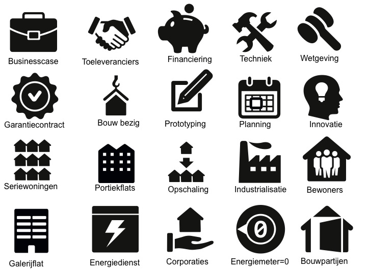 De focus zal de komende 5 jaar vooral liggen op het meest voorkomende woningtype; de rijtjeswoning. Daarna zal de focus verschoven worden naar andere veel voorkomende woning-typologieën die op een geïndustrialiseerde manier aangepakt kunnen worden. Onderstaande tabel laat zien dat het dan gaat om zo’n 3 miljoen huizen. De genoemde prijzen zullen per woningtypologie sterk gaan differentiëren. De verwachting is echter dat energieverbruiken gemiddeld genomen zullen passen bij de kosten van de aangeboden renovatieproposities. Uiteindelijk zal de spin-off van een dergelijke aanpak zorgen dat er ook slimme componenten ontwikkeld zullen worden voor huizen die minder passen bij volledig geïndustrialiseerde aanbod. Zoals bijvoorbeeld vrijstaande woningen, vooroorlogse woningen en monumenten.