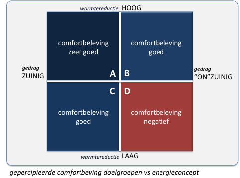 In onderstaande figuur probeer ik die twee doelgroepen te duiden. Daarbij kunnen we er vanuit gaan dat de grootste groep van de mensen in het rooie gebied verkeren zodra ze afstand doen van hun gasaansluiting. De vraag is dan of ze zich moeten aanpassen voor concepten uit kwadrant C en zich een nieuwe perceptie van comfort moeten aanleren of dat er oplossingen zijn voor de comfortbeleving van kwadrant B. Beide kan. Maar wat wij geleerd hebben van onze experimenten is dat de meeste mensen zich in kwadrant B het meest thuis zullen voelen.