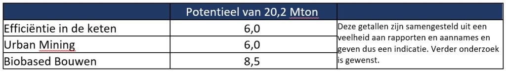 Let op, deze tabel kan niet opgeteld worden. Biobased en Urban Mining verdringen traditionele materialen en de combinatie van Urban Mining en Biobased telt nog niet op naar 20,2 Mton. Dat zegt iets over de urgentie en het zegt dat we het niet oplossen met louter een focus op materialen. Ook de bouwpraktijk staat ter discussie: productieprocessen, bouwmethoden, stadsplanning, ontwerp uitgangspunten, kwaliteitspercepties etc. etc.