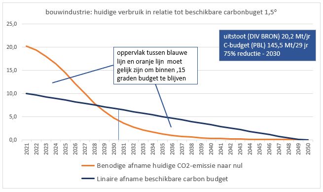 Het wereldwijde CO2-budget om onder de 1,5 graden Celcius verhoging te blijven bedraagt volgens het IPCC 420 Gton (bron). De makkelijkste manier om die door te zetten naar Nederland is uitgaan van het inwonertal met een bepaalde verhoudingscorrectie ten opzichte van de huidige emissie. PBL heeft dat gedaan met een omrekenfactor van 0,21% maal 1,5 (bron). Het Nederlandse budget tot 2050 komt daarmee op 1.323 Mton. De bouwsector neemt voor het produceren van grondstoffen, materialen, producten en gebouwen ongeveer 11% voor haar rekening (bron). Dat betekent dus 145,5 Mt. Verdeeld over 29 jaar zou dat anno 2021 resulteren in een jaarbudget van ca. 10 Mton lineair, aflopend naar 0 in 2050. De bouwsector heeft nu een jaarlijkse uitstoot van 20,2 Mton CO2 (bron) (dichtbij de uitstoot ten gevolgde van de warmtevraag in de gebouwde omgeving), die in 2050 op 0 moet uitkomen. We zitten dus op dit moment een factor 2 te hoog ten aanzien van het beschikbare budget. De consequentie daarvan wordt duidelijk in bovenstaand plaatje. Om in 2050 op nul uit te kunnen komen moet er vooral de eerste 10 jaar een forse slag gemaakt worden. Anders wordt het onmogelijk om binnen het beschikbare budget te komen. Het is een wiskundige formule met heel weinig ruimte. Dat geldt overigens voor de complete klimaatopgave en is de reden warom de doelen van 2030 steeds naar boven worden bijgesteld.