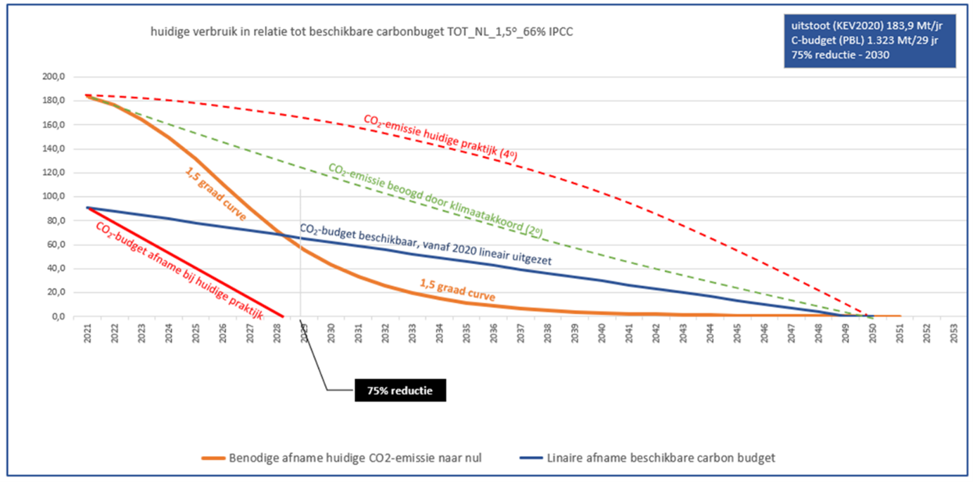 Willen we het Parijse klimaatdoel halen (zo dicht mogelijk eindigen bij 1,5 graden) dan moet daarvoor de komende 10 jaar de grootste stap gezet worden. Het is belangrijk om daarvoor niet in CO2-besparingsdoelen van overheden te denken. Die zijn namelijk niet afgeleid van de beschikbare klimaatbudgetten die gedefinieerd zijn rondom de verschillende IPCC-temperatuurstijgingscenario’s. Wanneer we uitgaan van CO2-budgetten dan is voor het halen van de 1,5 graad doelen per 2030 al een reductie van 75% nodig. Het halen van het klimaatdoelen is dus geen rechte lijn naar 2050. Dat komt omdat we nu ver boven het beschikbare jaarlijkse koolstofbudget zitten. We moeten dus voor zorgen dat er zo min mogelijk CO2 bijkomt uit wat voor bron dan ook.
